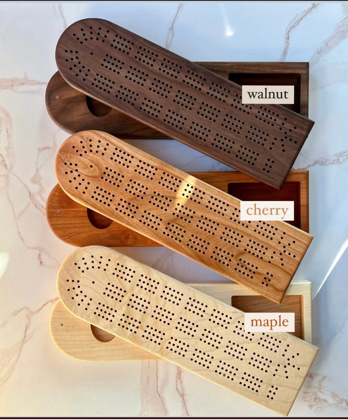 Our handmade wooden cribbage boards are ready to become your next family heirloom! The perfect addition to your coffee table or gift for the game lover in your life! These boards contain storage for cards and pegs.